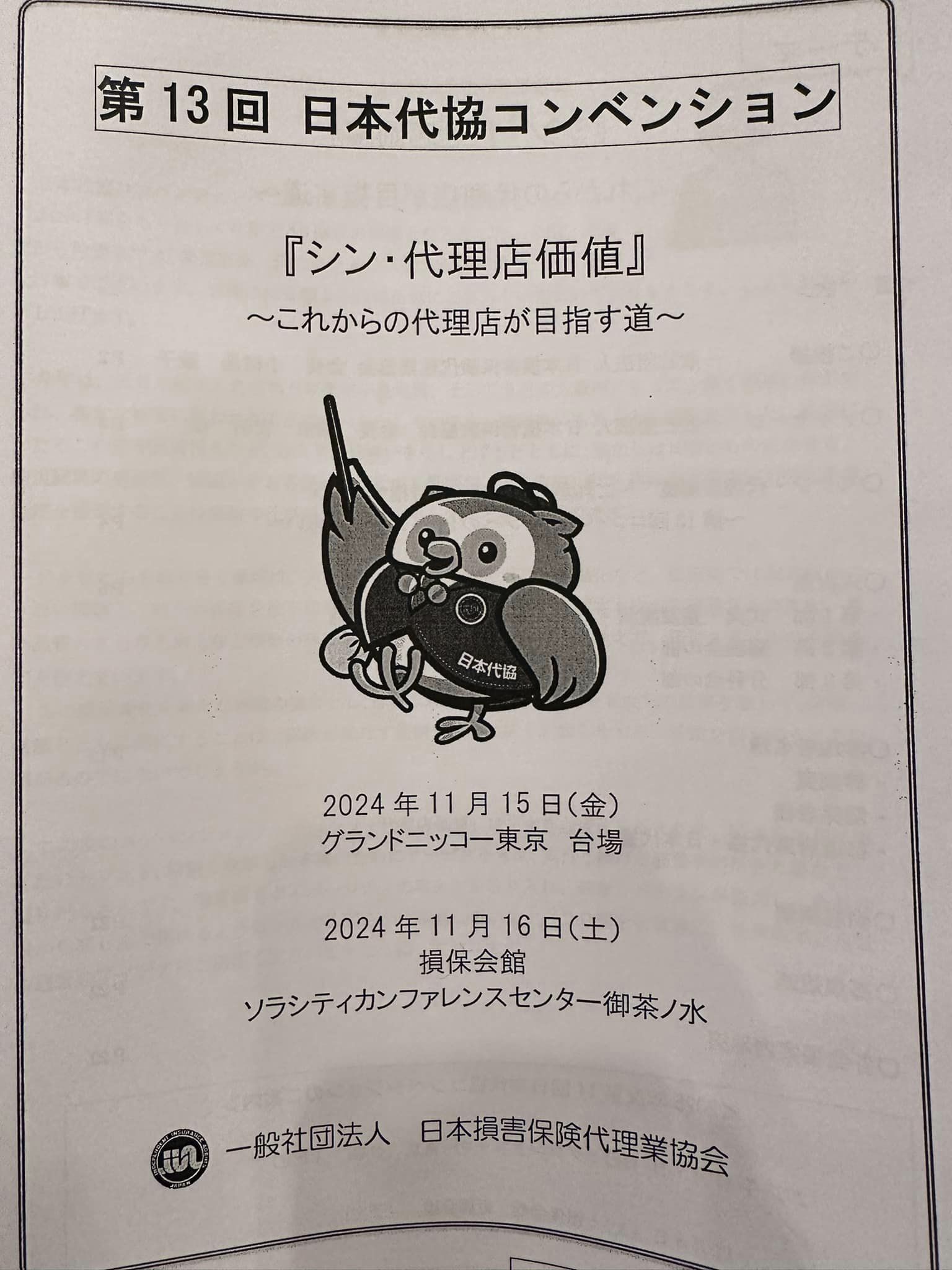 2024.11.16 千葉県損害保険代理業協会 2024年 一般社団法人 日本損害保険代理業協会コンベンション開催 第13回 日本損害保険代理業協会コンベンション11月15日(金)グランドニッコウ東京 お台場全国沖縄県から北海道まで47都道府県から約400人の会員が東京都お台場へ集まりました。何故か私も千葉県から数名参加の1名として来てます。自社の発展に、自分の意識の改革に役にたてばと思ってます。11月16日(土)損保会館・ソラシティカンファレンスセンター御茶ノ水2024年11月16日日本損害保険代理業協会コンベンション分科会第1セミナー『どうなるホケンの現在と未来ー2024プロ代理店の直面する課題と展望』第2セミナー『「損保問題」の本質と保険会社経営の今後を探る』第3セミナー『環境認識を踏まえた「次世代型代理店像とマーケット開拓」』第4セミナー『すべての問題は解決できる』私は第2セミナー受講です