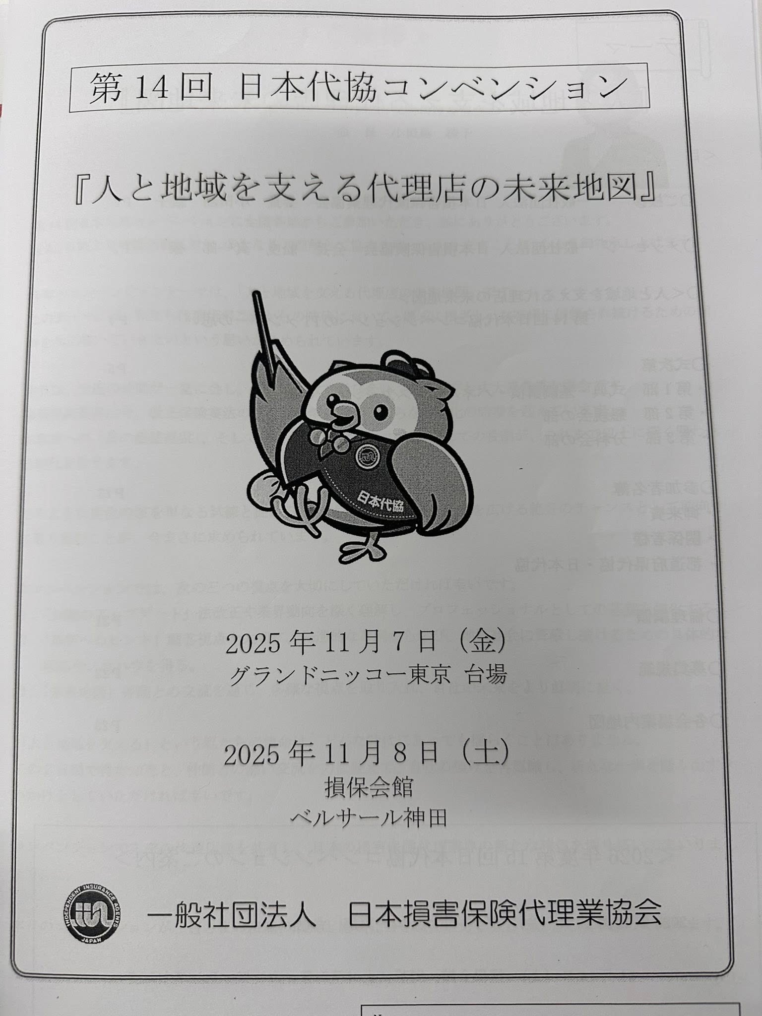 2025.11.08 日本損害保険代理業協会 第14回日本代協コンベンション参加 【第14回 日本代協コンベンション】『人と地域を支える代理店の未来地図』千葉県代協から2日間参加です。北海道から沖縄までの400人以上の代理店が参加2025年11月7日(金)13:00から17:10グランドニッコウ東京 お台場[東京都港区]同年8日(土)10:00から12:00損保会館[東京都千代田区]ベルサール神田[東京都千代田区]知らない事知りたい事人生たくさんありますね。